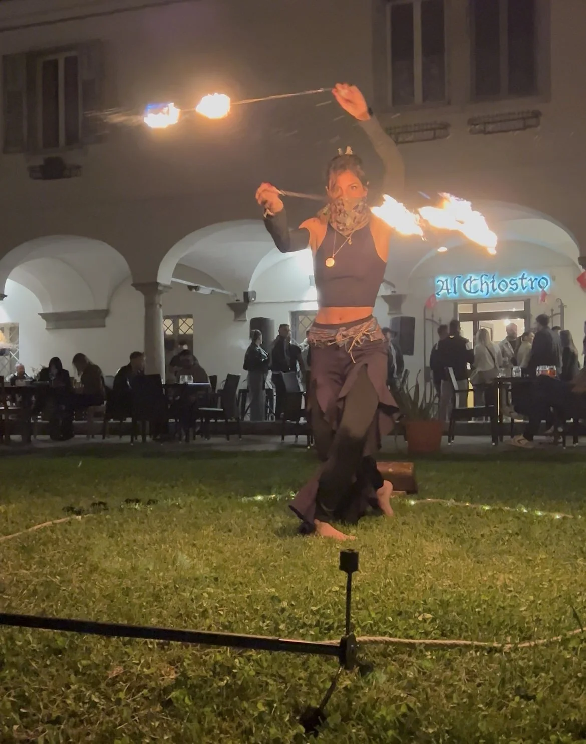Ciao sono Aurora, originaria di Gorizia nel FVG, sono una ballerina con il fuoco professionista da 2 anni.